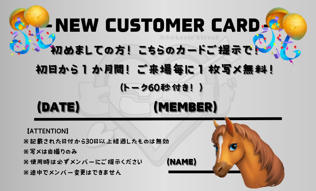 初めてとこらびの現場へ遊びに来る方へ! 初めましてから1ヶ月間!ずっと! なんと毎回無料で写メを1枚撮り続けられるスペシャルなカードをお渡しいたします! お友達を誘って是非みんなで遊びに来てください♪♪ 1月5日の初LIVEからスタートします!